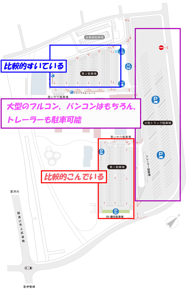 駐車場は下記駐車場図のように大きく3つの区画に分かれている。すごいのは、大型のキャンピングカー、トレーラーも止められるスペースがあること。そして、普通車の車中泊なら第2駐車場がおすすめ!比較的すいていて静かに休むことができと思います。