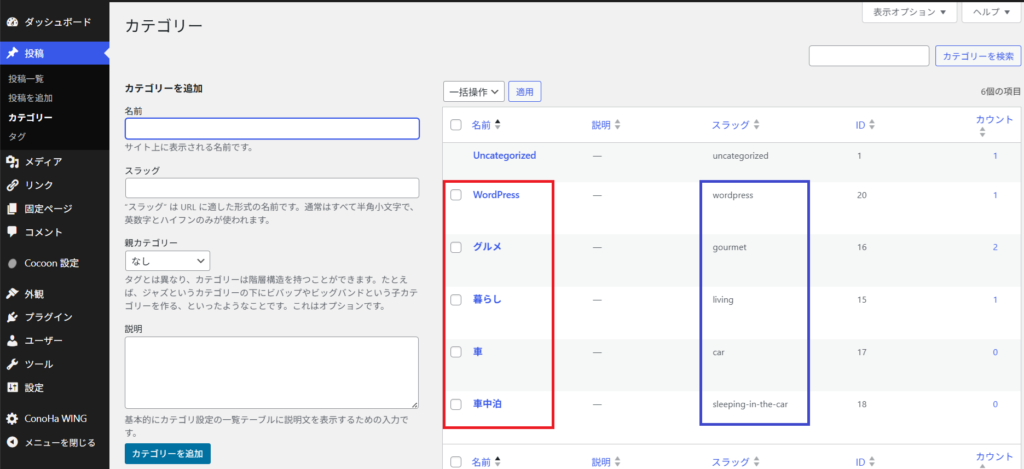 すると、画面右側に入力したカテゴリー名とスラッグが追加されます。