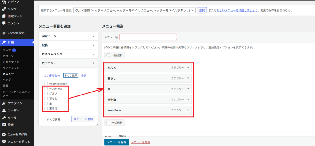 メニュー作成画面が開くので、ここで先ほど設定したカテゴリーをメニューに追加していきます。